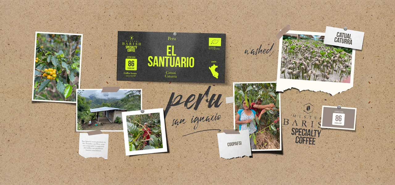 De Origine van El Santuario Specialty Coffee is San Ignacio in Peru, zoals eerder vermeld. Voor deze Specialty Coffee wordt de gewassen methode gebruikt. Bij de gewassen methode, ook wel de wet method genoemd, gaat men de bessen wassen totdat het vruchtvlees volledig verwijderd is. Men doet dit zo snel mogelijk na het plukken, de bonen volgen hierna een apart selectieproces. De boeren laten de bonen een waterkanaal volgen, waar de onrijpe en rijpe bessen gescheiden worden door middel van een floating selection. De rijpe bessen gaan zinken, deze zijn matuur en van betere kwaliteit. Hierna worden de bonen op bedden uitgestald waar ze drogen. Gewassen koffies zijn heel clean van smaak, alle heerlijke smaken van de origine komen door dit proces goed naar boven. Wat resulteert in een levendige, frisse koffie met een lichte aciditeit en een hint van zoete en florale aroma’s.