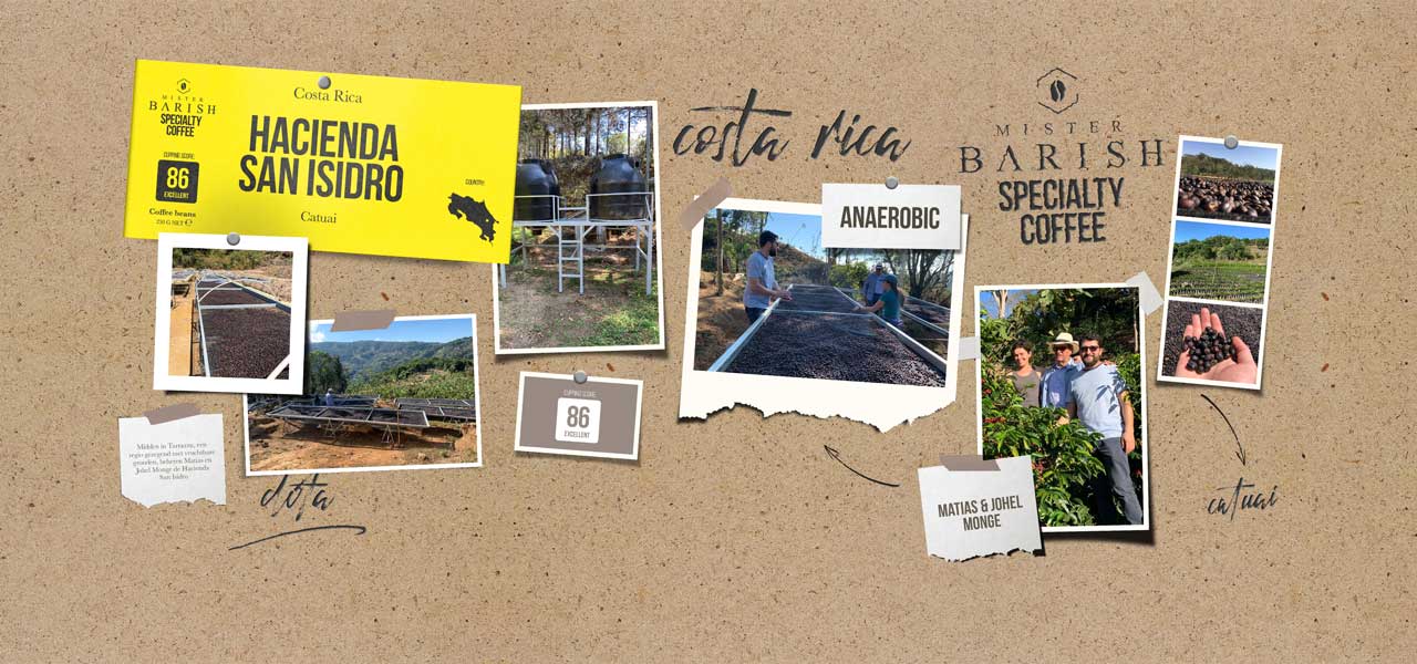 De Origine van de Hacienda San Isidro Speciaty Coffee is Dota, Costa Rica, zoals eerder al werd aangegeven. Matias en zijn vader Johel Monge zijn de boeren die ervoor zorgen dat deze bonen de heerlijke smaak krijgen die ze hebben. Ze gebruiken hiervoor anaerobe fermentatie. Deze koffieverwerkingsmethode is een vrij recente methode, en heel populair ook dezer dagen. Men gaat de bes ontpulpen, maar het vruchtvlees wordt aan de boon gelaten. De gepelde bessen worden in hermetisch afgesloten watertank geplaatst waar de fermentatie begint. Door de fermentatie gaat het vruchtvlees loskomen van de boon waardoor de bonen als het ware weken in het vruchtvleeswater. Zonder de bonen te wassen leggen de boeren ze op bedden te drogen. Dit resulteert in een koffie met complexe smaken, een explosie van fruitige smaken.