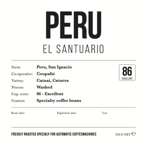 De Origine van El Santuario Specialty Coffee is San Ignacio in Peru, zoals eerder vermeld. Voor deze Specialty Coffee wordt de gewassen methode gebruikt. Bij de gewassen methode, ook wel de wet method genoemd, gaat men de bessen wassen totdat het vruchtvlees volledig verwijderd is. Men doet dit zo snel mogelijk na het plukken, de bonen volgen hierna een apart selectieproces. De boeren laten de bonen een waterkanaal volgen, waar de onrijpe en rijpe bessen gescheiden worden door middel van een floating selection. De rijpe bessen gaan zinken, deze zijn matuur en van betere kwaliteit. Hierna worden de bonen op bedden uitgestald waar ze drogen. Gewassen koffies zijn heel clean van smaak, alle heerlijke smaken van de origine komen door dit proces goed naar boven. Wat resulteert in een levendige, frisse koffie met een lichte aciditeit en een hint van zoete en florale aroma’s.